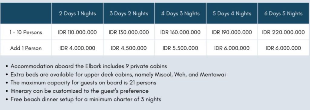 Elbark is a modern-built, boutique phinisi vessel available for private charters through the incredible waters and scenery of the Indonesian Archipelago. Elbark is a custom built phinisi style yacht that launched in October 2022. Carefully designed by experienced, Elbark evokes Indonesian heritage with locally sourced wood and traditional boatbuilding methods.Being used as an expedition boat for small groups or families around. Designed with an emphasis on space, privacy, and comfort, Elbark have 9 generous cabins on three decks, an intimate and cozy lounge & dining room, a spacious sky deck, and a sunbathing area on the main deck. Elbark has plenty of lounge areas for everybody.